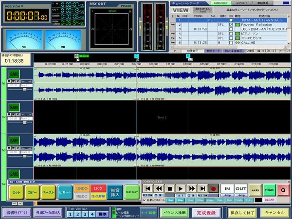 上位EDPSからの番組情報データで指示されたファイル名・番組名・番組長・Q回数等をもとに完パケ番組の録音・編集とCUE設定ができます。完成した番組を一本化し、BWF-Jフォーマットで出力後、DAFへ送信します。
