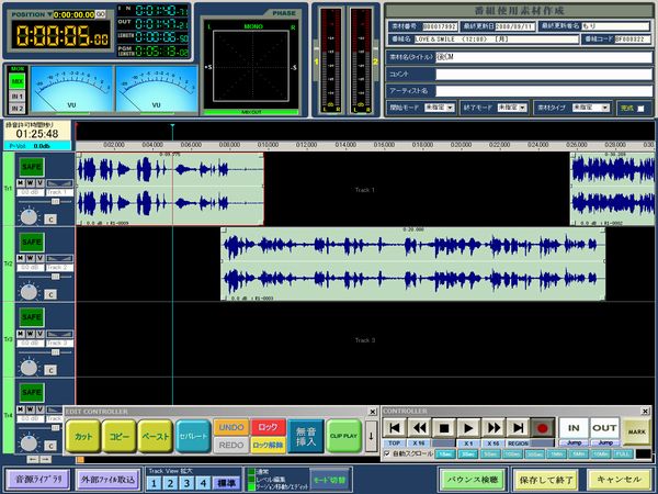 編集はタイムライン上で波形を見ながら行うことが可能で、メーター類はVUメーター・ピークメーター・フェーズメーターを配置しています。